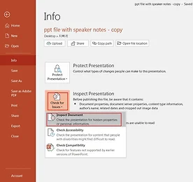 ppt 썸네일형 리스트형 프리젠테이션 파일에서 발표자 노트 삭제하기 프리젠테이션 파일에서 발표자 노트 삭제하는 방법에 대하여 알아보겠습니다. 우선 발표자 노트를 삭제할려면 ppt 파일을 오픈합니다. 1. 그리고 File > Check for Issues > Inspect Document를 클릭합니다. 2. 그러면 창이하나 뜨는데 거기서 맨 밑으로 가면 Presentation Notes라는 게 있는데 이것이 체크되어 있는지 우선 확인하다음 체크가 안돼어 있으면 체크하시고 Inspect 버튼을 누릅니다. 3. 발표자 노트가 있는 경우 "Presentation notes were found"라고 나옵니다. 그리고 그 옆에 'Remove All' 가 있습니다. 모두 삭제를 하시길 원하시면 'Remove All' 버튼을 클릭하시면 됩니다. 더보기 이전 1 다음